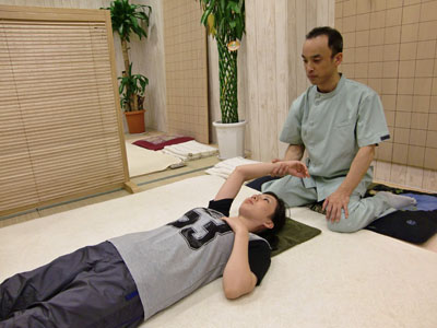 検査により体のゆがみが確認できたら、患者さんのゆがみに合わせて技(手足を軽く動かし姿勢反射を起こす)を掛けていきます
